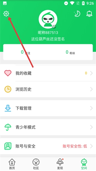 在应用首页底部点击【空间】按钮就能进入对应的页面,这个页面可以访问个人相关功能,另外首页还展示了游戏推荐之类的内容。