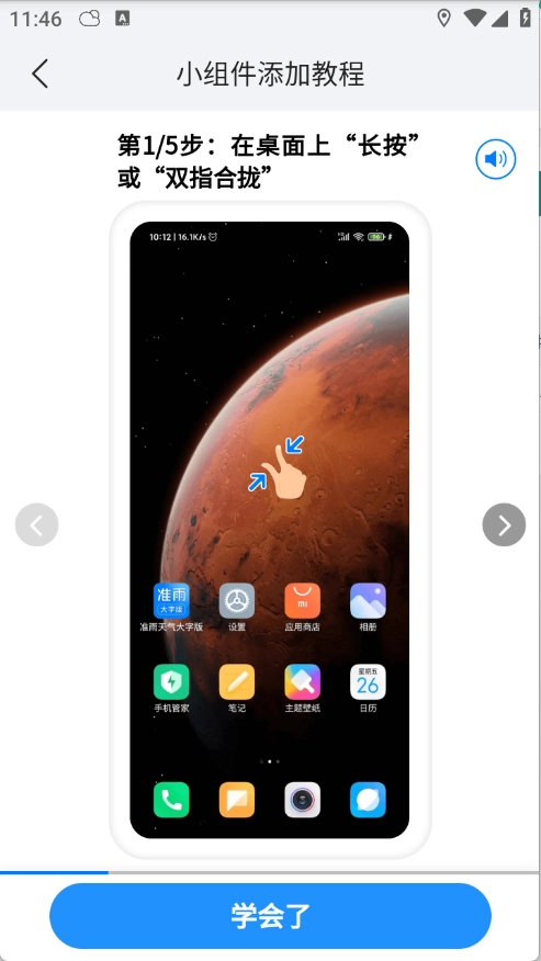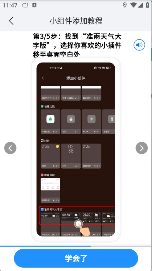 找到“准雨天气大字版”应用,挑选你心仪的小插件,把它移动到桌面的空白区域就可以啦。