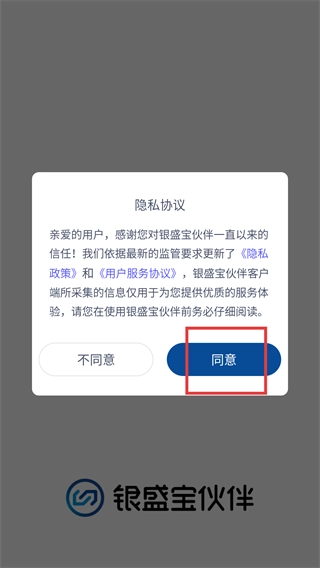 在“隐私协议”弹窗中,点击【同意】按钮,确认接受《隐私政策》和《用户服务协议》,即可进入应用登录界面。