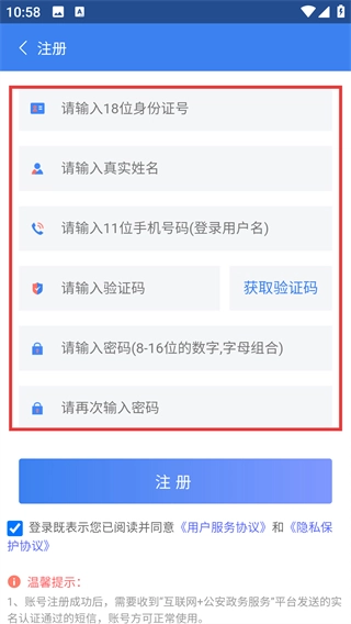 在注册页面按顺序填写【18位身份证号码】【真实姓名】【11位手机号码】等信息,然后获取并填写验证码。