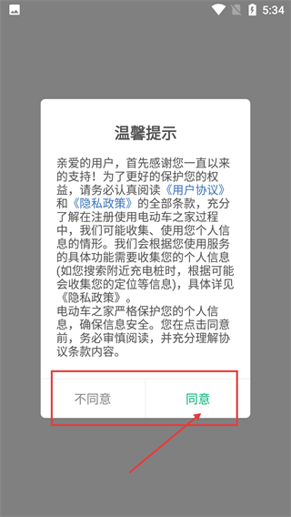 在阅读温馨提示中的【用户协议】和【隐私政策】条款后,点击【同意】按钮,就能进入应用开展后续操作。