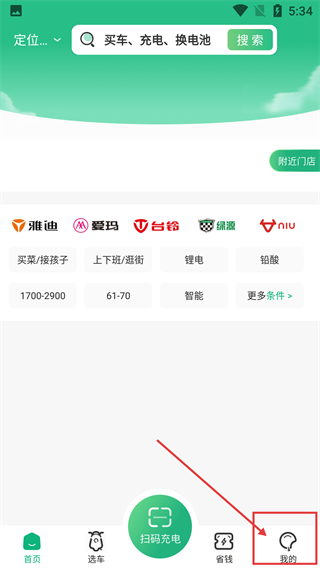 在应用首页,点击底部导航栏的【我的】选项,就能进入个人中心页面,首页另外还具备选车、扫码充电等功能。