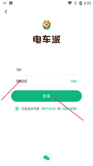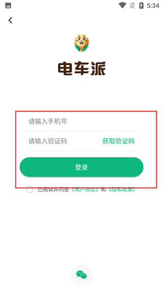 在【电车派】的登录界面,输入【手机号】,获取并填写【验证码】,勾选相关协议后,点击【登录】按钮以准备登录。