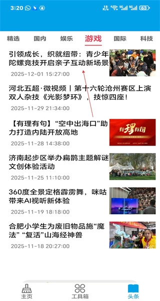 点击游戏分类标签,切换至游戏分类的头条页面,查看该分类下对应的资讯内容。