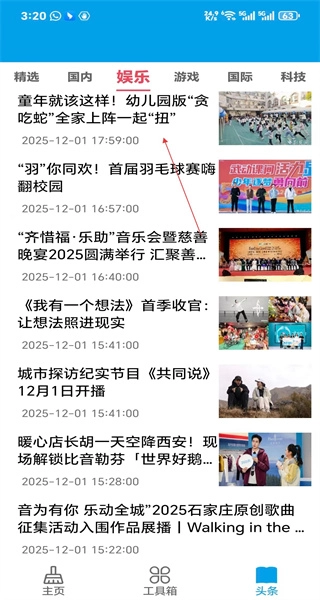 进入头条页面后,点击娱乐分类标签,查看该分类下的各类资讯文章,浏览相关内容信息。