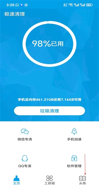 打开软件后,首页会显示内存使用情况,还设有垃圾清理等功能入口;点击头条按钮,即可进入对应的头条内容页面。