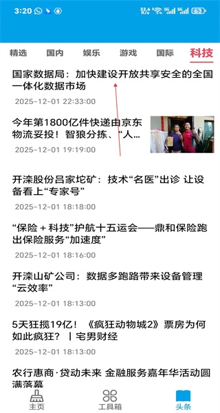 挑选科技类的分类标签,进入科技分类对应的头条页面,查看这个分类下的各类资讯文章内容。