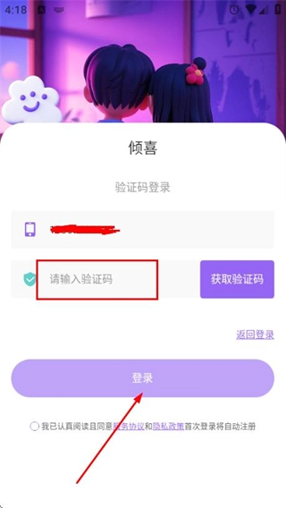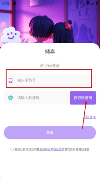 在登录界面输入手机号码,勾选相关协议后,点击“获取验证码”按钮。