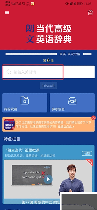 1、第一步是打开朗文词典App,接着在主页找到位于顶部的搜索栏并点击它。