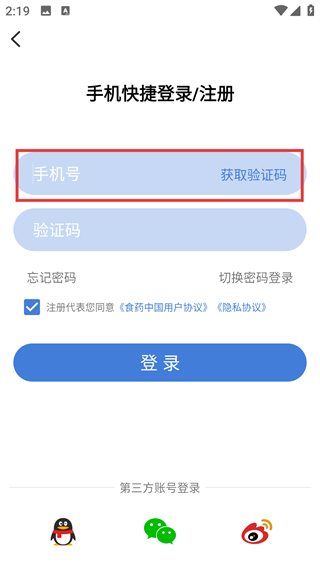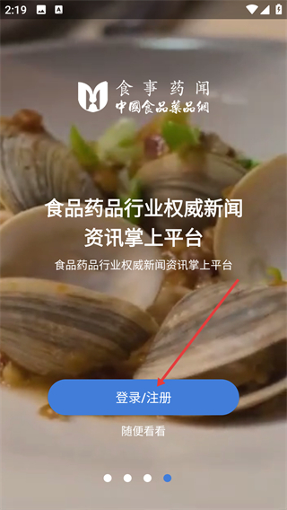 1、打开【食事药闻】应用,在启动页面找到并点击【登录/注册】按钮,即可进入手机快捷登录与注册的界面。