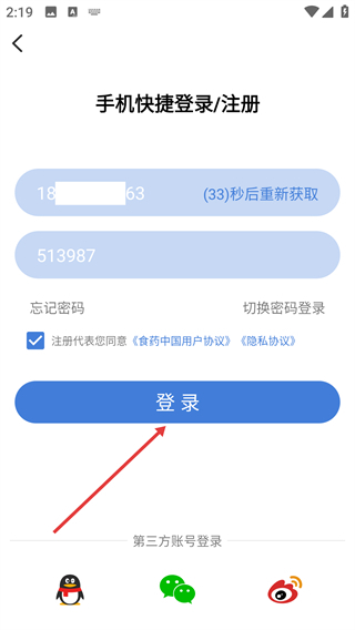 3、在验证码输入框中填写收到的验证码内容,并确认已勾选【用户协议-隐私政策】。