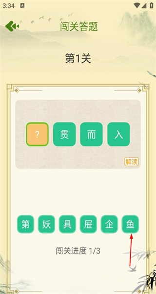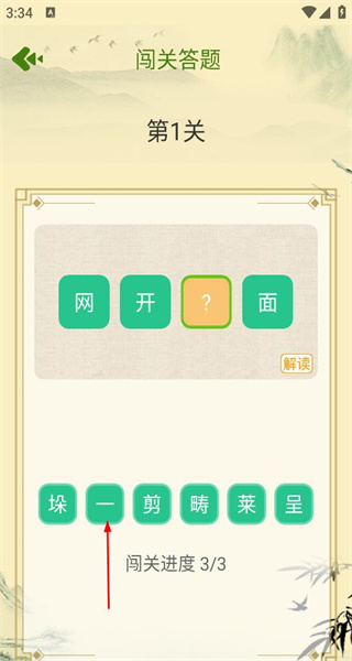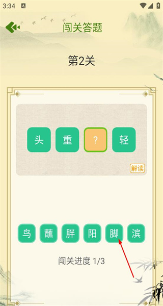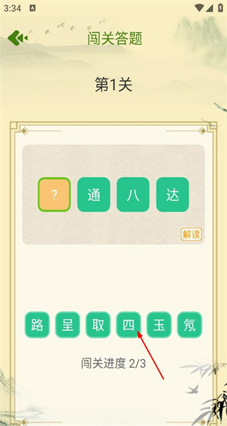 2、当第1关的进度推进到三分之一时,查看更新后的成语填空区域,挑选新给出的备选字来填补成语里的空缺部分,以此将关卡进度推进到三分之二。