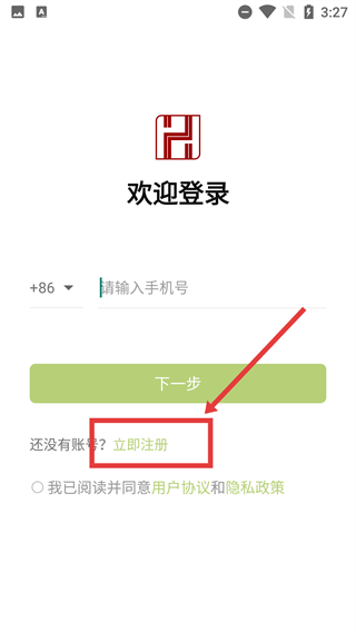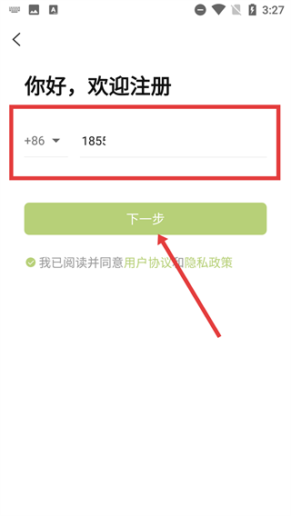 3、进入注册页面后,填写手机号并勾选“我已阅读并同意用户协议和隐私政策”,随后点击【下一步】按钮,即可进入注册验证环节。