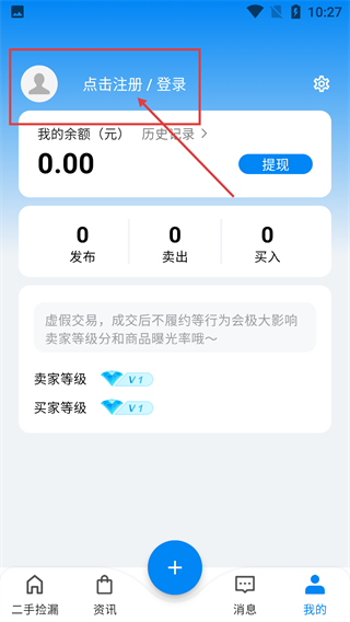 2、进入【我的】页面后,点击顶部的【点击注册/登录】区域,即可进入登录流程,完成登录后就能使用余额、交易等功能。