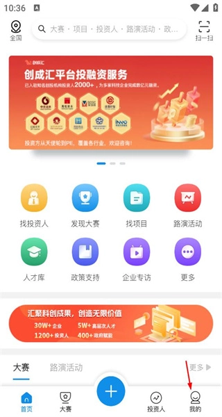 打开软件进入首页后,能看到投融资服务、找投资人等功能选项,接着点击底部的“我的”,即可进入个人中心页面。
