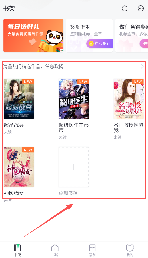 打开App后,建议先留意书架页面的福利区域,通过每日签到和完成任务可以获取相当多的阅读资源。