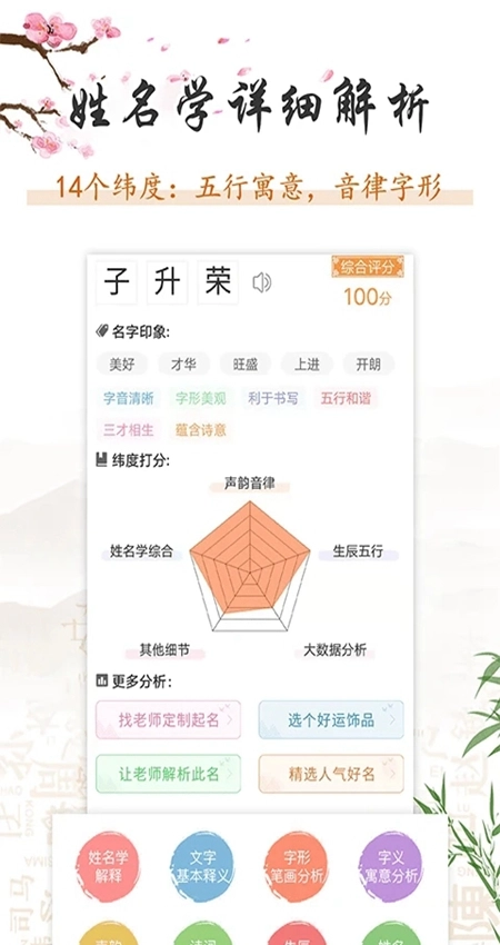 4.命名寓意:为婴儿、宝宝、小孩、新生儿起名字,融合诗词、楚辞、论语、唐诗、宋词、国学等元素,同时也提供英文起名服务,传承传统文化起名学的精髓,助力家长为孩子取名、进行姓名分析以及改名。