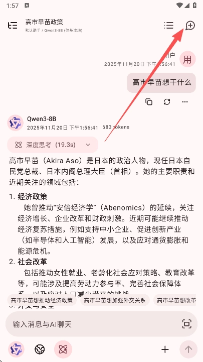 1、在我们完成上一个问题的询问后,可点击右上角的+号来开启新的对话。