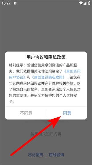 1、启动卓创短讯客户端,当出现隐私政策弹窗时,点击“同意”按钮。