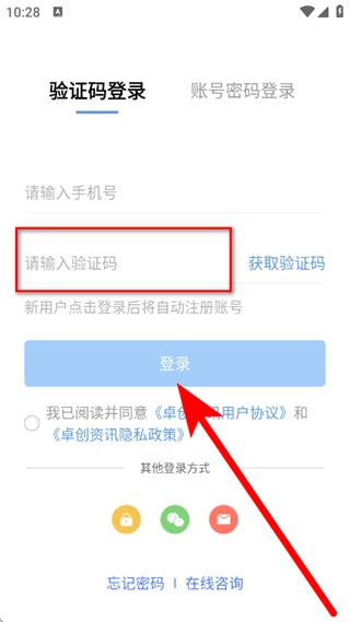 2、在登录页面,选择验证码登录方式,跳转至验证码登录页面。