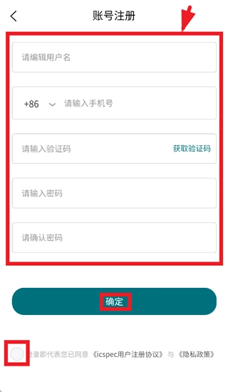 在账号页面填写用户名、手机号、验证码和密码,勾选“登录即表示您已同意《icspec用户注册协议》及《隐私政策》”后,点击确认按钮即可完成操作。
