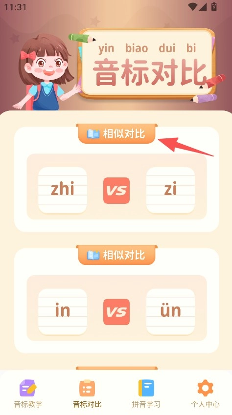 3、点击“音标对比”选项,即可查看相似音标的对比内容,帮助区分容易混淆的音标。