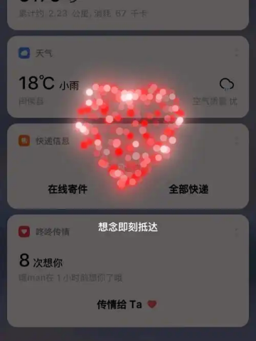 咚咚传情【02-23更新】是OPPO广东移动通信推出的一款专注于情感传递的特色应用,情侣完成手机绑定后,能随时感知彼此的思念。2025最新版借助近场通信(NFC)技术,用户在手机息屏时一笔画心,心意便会以动画形式发送至绑定的对方手机,还可通过震动、声音、光线闪烁等多种方式强化体验。