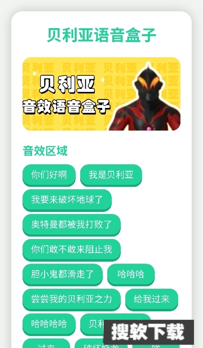 丰富语音资源:收录了大量贝利亚奥特曼在动画、影视作品中的经典台词和声音片段,像贝利亚的战斗呼喊、技能释放音效等,能让用户瞬间沉浸在奥特曼的战斗场景里。