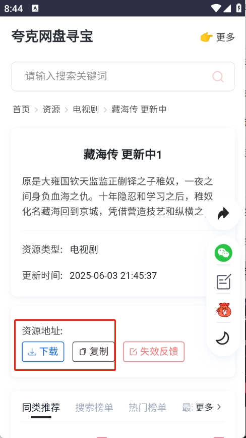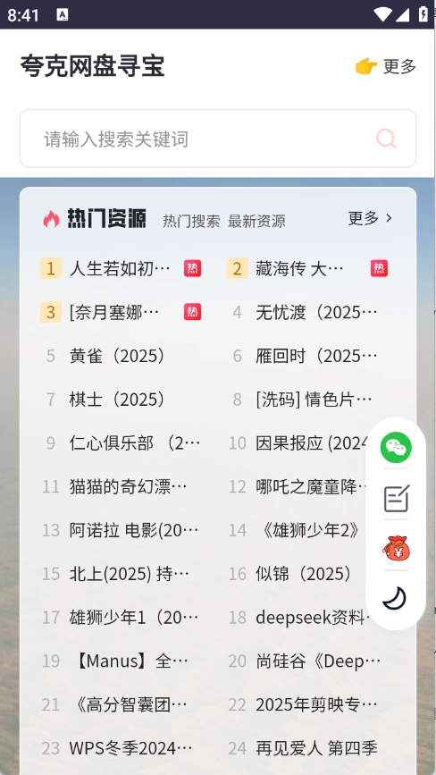 夸克网盘寻宝是一款强大的网盘搜索工具,无论是影视还是音乐都能轻松搜索到。你可以对搜索到的内容进行复制链接操作,而且所有资源都是免费提供的。它能帮你一键搜索全网资源,不仅不限速,资源更新速度还很快。
