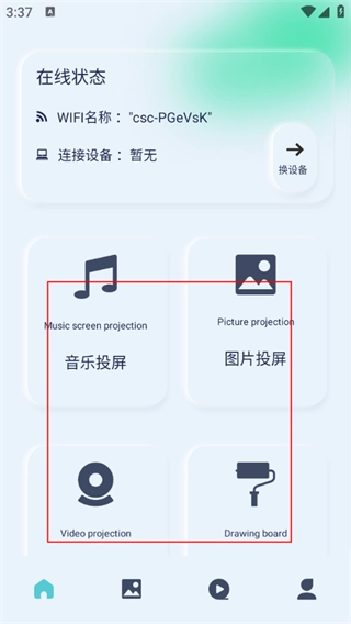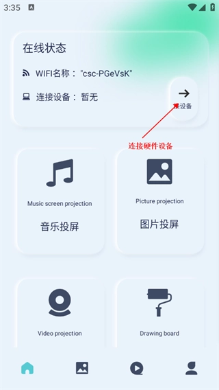 首页提供音乐投屏、图片投屏和视频投屏三种投屏方式,使用投屏功能前需先连接硬件设备,具体操作可参考图示。