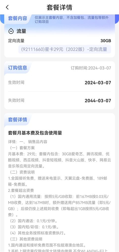 3、点击具体套餐名称,即可查看该套餐的详情、有效期以及使用情况。