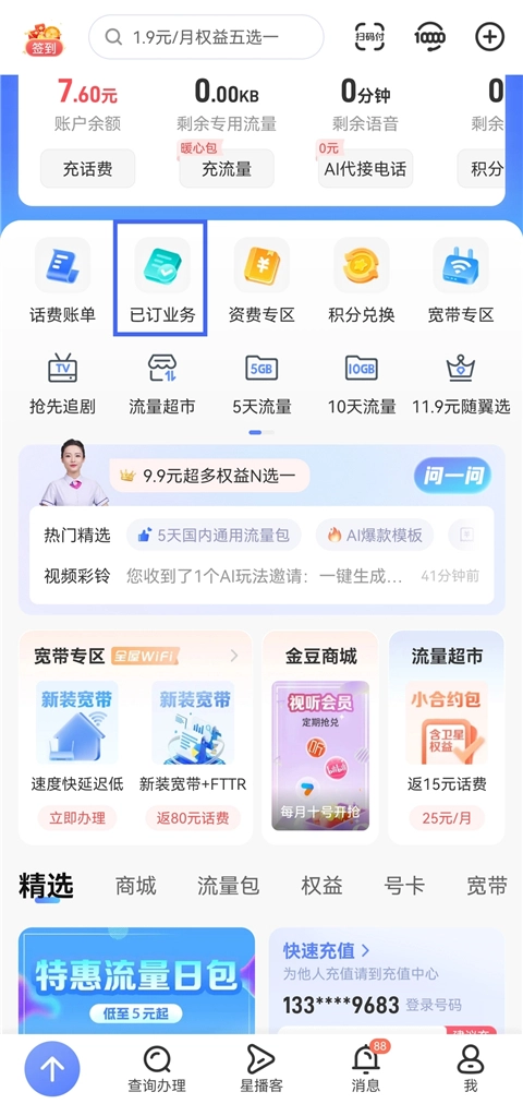 1、打开应用进入首页,点击【已订业务】查看当前套餐情况