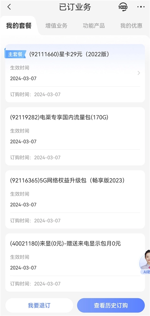 2、在【我的套餐】板块里展示当前处于生效状态的全部套餐信息