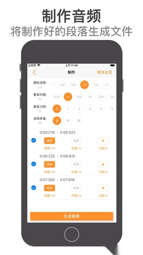 【收藏笔记】 收藏复读笔记后,系统会自动把音频分割成当前时间段对应的小音频片段