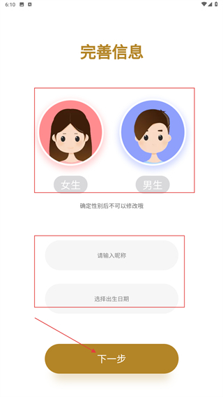 1、进入“完善信息”页面后,先选择性别(女生/男生),接着输入昵称、选定出生日期,随后点击【下一步】按钮,即可完成信息完善操作。
