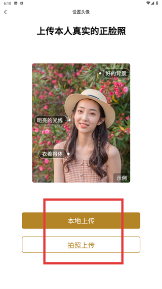2、进入“设置头像”页面后,可通过选择【本地上传】从手机相册中选取图片,或点击【拍照上传】直接拍摄照片,以此完成头像的设置操作。