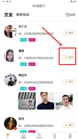 3、在“祥瑞媒介”的交友页面中,找到目标用户后,点击其旁边的【聊天】按钮,即可进入和该用户的对话界面。