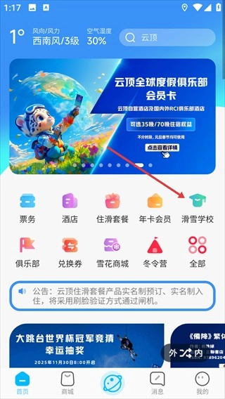 1、在首页找到并点击【滑雪学校】选项,即可进入云顶国际滑雪学校的页面。