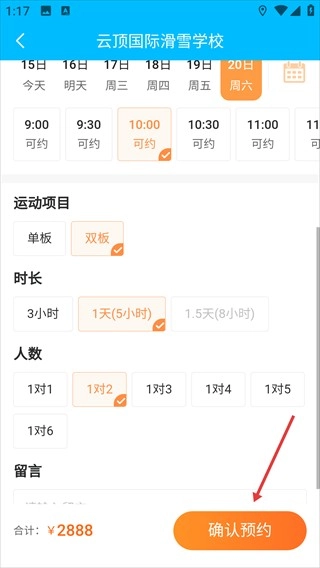 4、在确认所有预约参数无误后,点击页面底部的【确认预约】按钮,即可完成对该教练的预约操作。