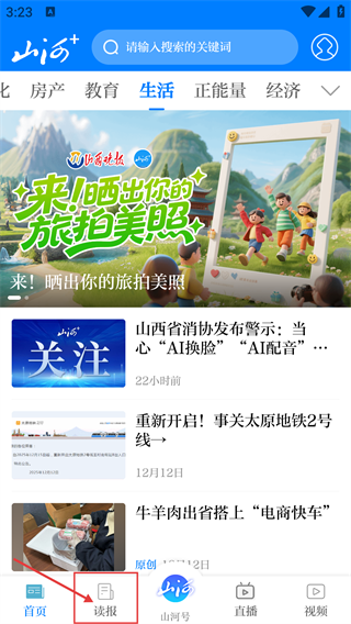 1、在【山河+】首页,点击底部的【读报】选项,进入读报功能页面,即可浏览各类报刊内容。