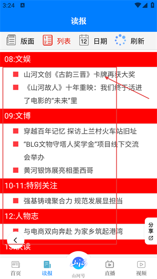 3、在读报列表页面,找到目标分类(例如08:文娱),点击该分类下的对应条目,就能进入内容详情页。