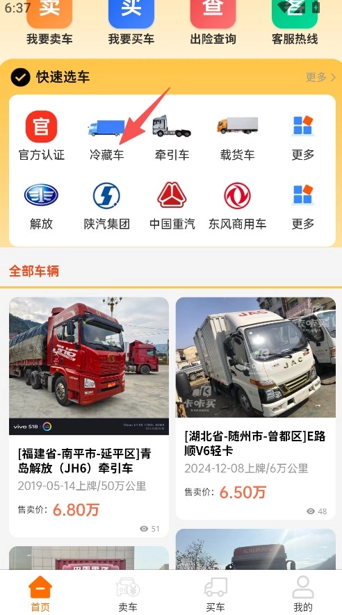 1、进入首页,在快速选车中选择对应车型如冷藏车。