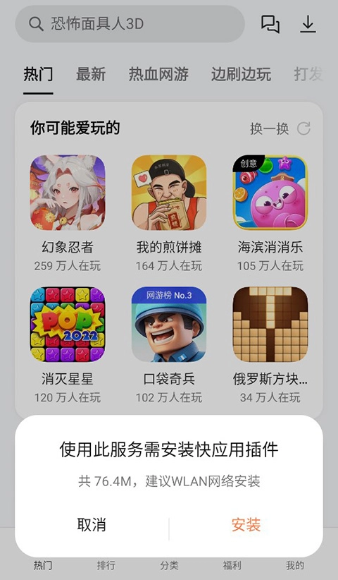 2、点击小游戏,若使用的不是OPPO手机,会提示需要安装快应用插件,点击安装即可。