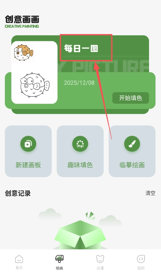 1、核心创作入口位于首页:“每日一图”属于限时挑战类,“新建画板”是自由创作的空间,“临摹绘画”更适合用来练习基本功。大家可以根据自己的心情随意选择。