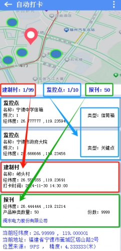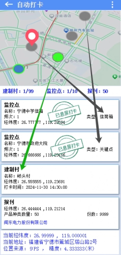 打卡后,监控点与建制村的状态会显示为“已息屏打卡”,此时打卡成功对应的范围标识会从蓝色圆圈转变为灰色圆圈(详见下图5);而报刊类的总数据会自动完成打卡并消失;若点击未打卡的数据条,其对应的打卡范围标识则会变为绿色圆圈(见下图)。