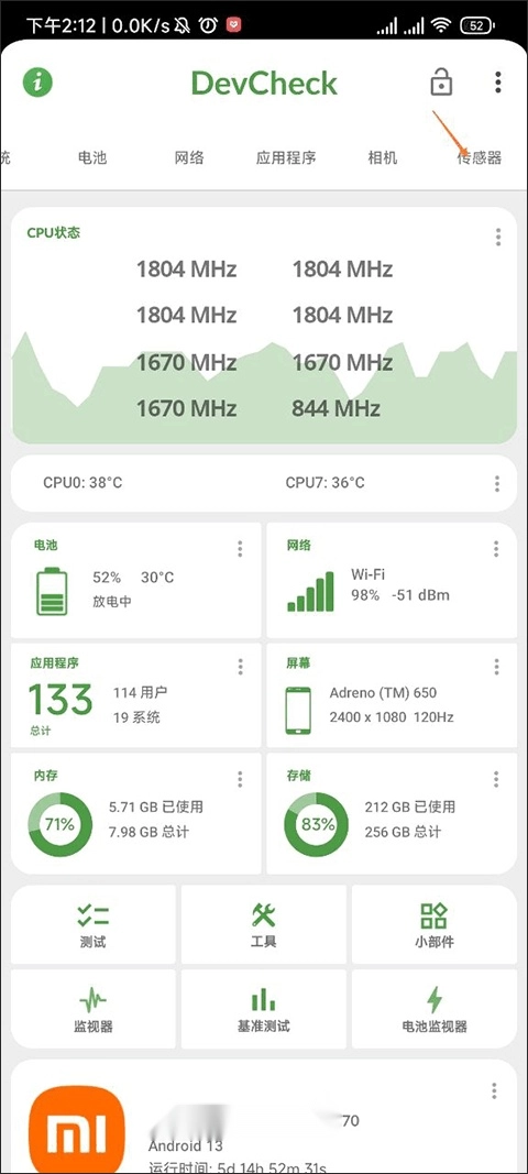 我们先打开DevCheck应用,在顶部可左右滑动的选项列表里找到最后一项【传感器】,点击它就能进入传感器的详细页面了。