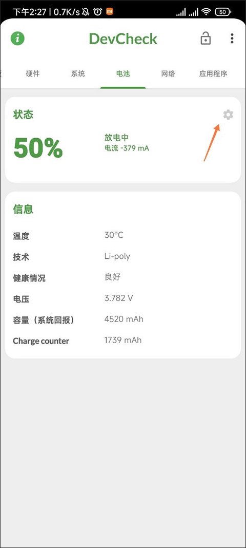 在这个页面我们可以查看手机的电池信息,只需点击状态右上角的那个小齿轮。