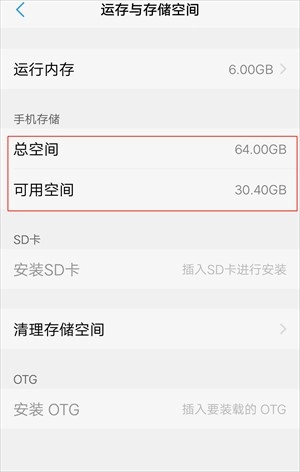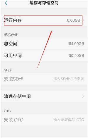 2、在运存与存储空间中就能查看手机内存的总空间和可用空间(红框标注处)