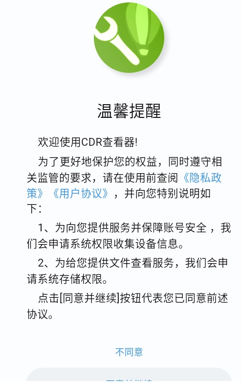 1、打开cdr查看器点击同意并继续。
