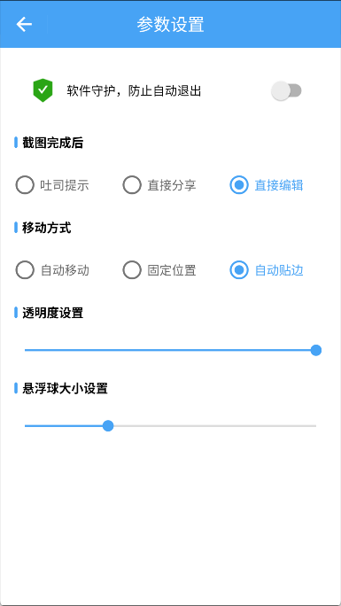 4、点击右上角即可打开参数设置界面,在这里能够对截图完成后的后续操作、悬浮球的移动方式等相关设置进行调整。